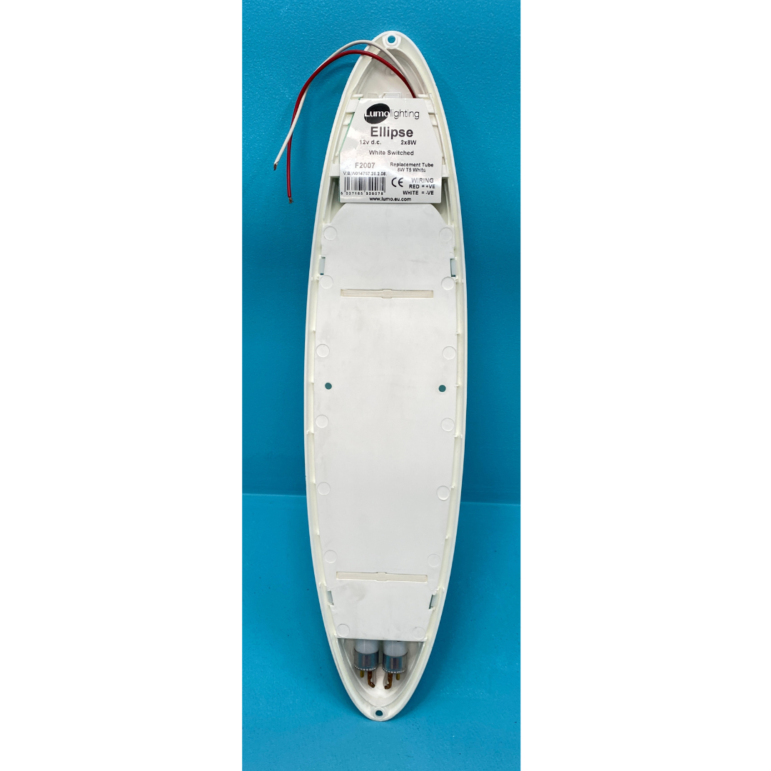 12V  X LUMO " ELLIPSE " FLUORESCENT CARAVAN / RV CEILING LIGHT WITH ON/OFF SWITCH FITTED.....WHITE EXTERIOR BASE COLOUR.