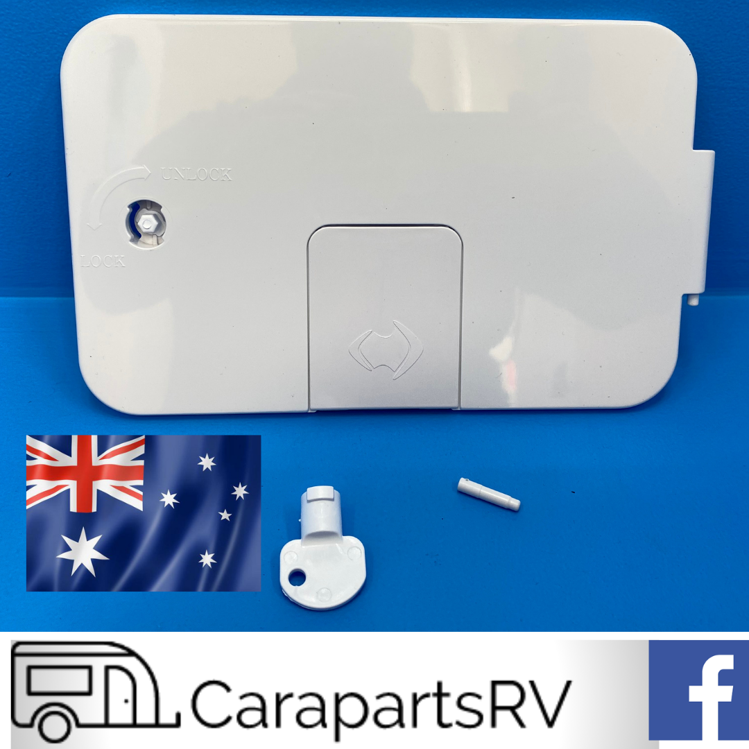 REPLACEMENT DOOR SET HINGE PIN AND SINGLE KEY FOR JAYCO NEW STYLE WATER FILLER ONLY.