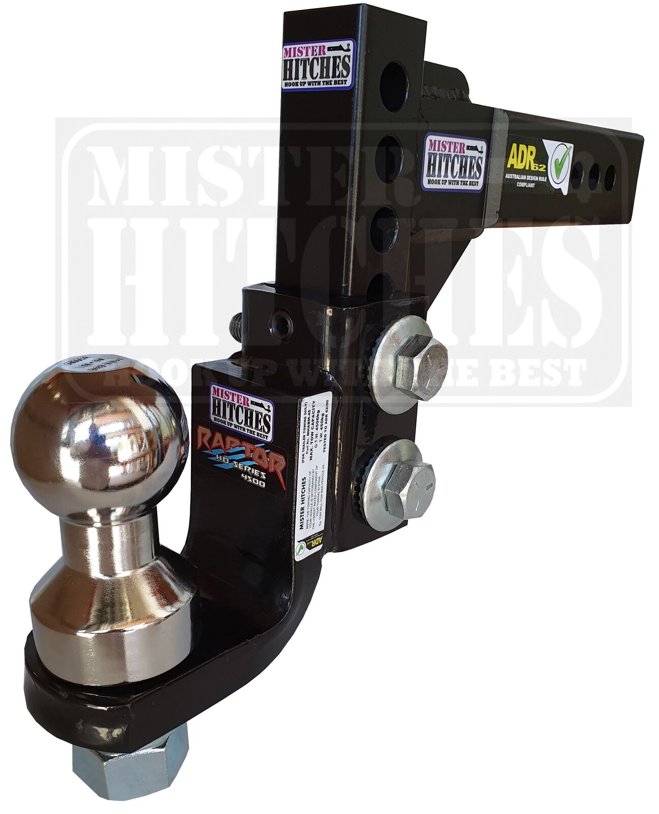 The Mister Hitches Raptor 4500KG Super Duty Adjustable Hitch with a 63.5mm / 2-1/2" Shank is a heavy-duty towing accessory designed to cater to specific vehicles like RAM, Silverado, GMC, and Ford F-Series.